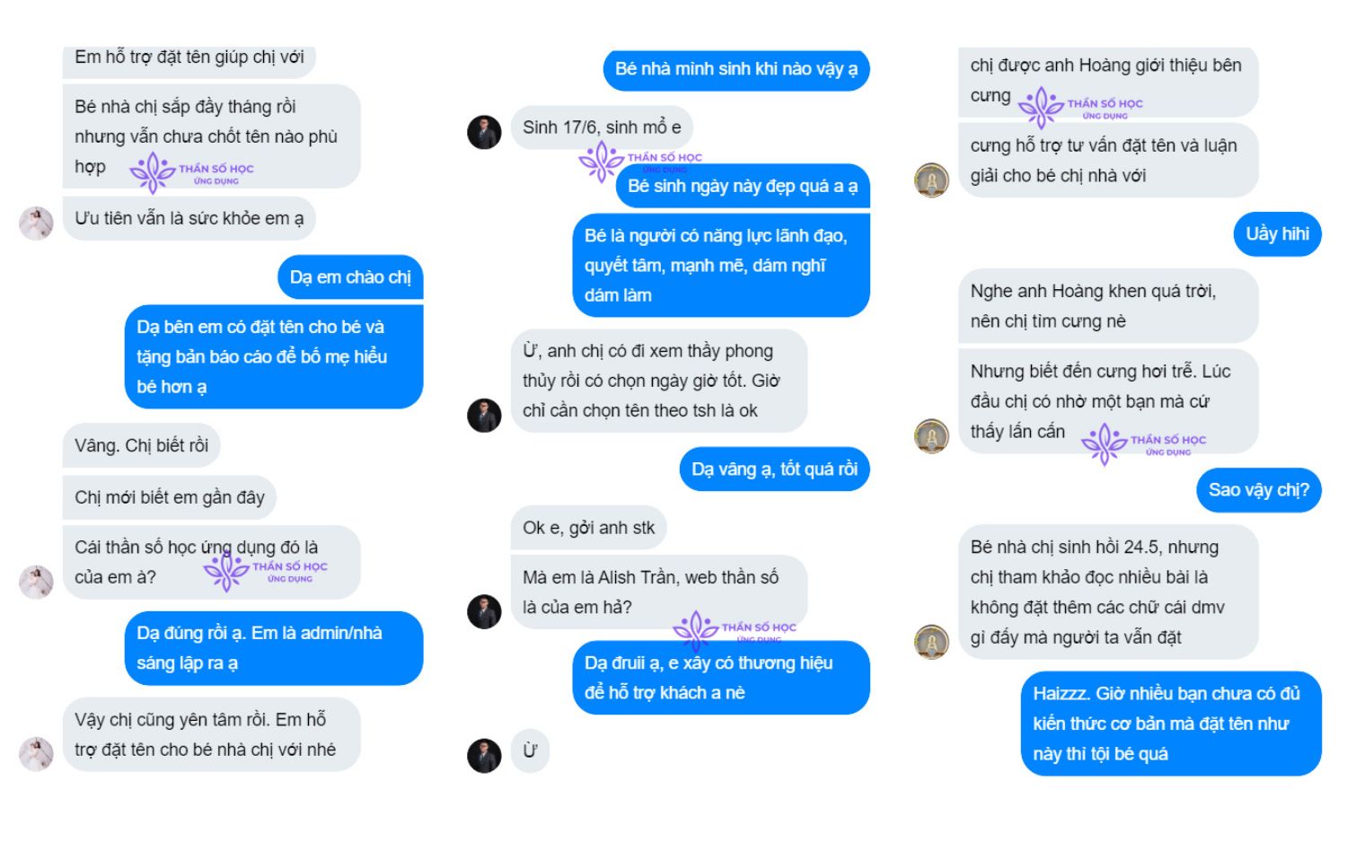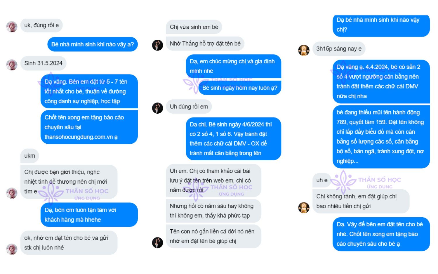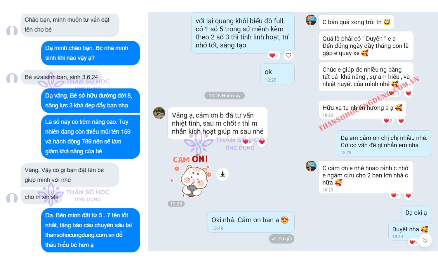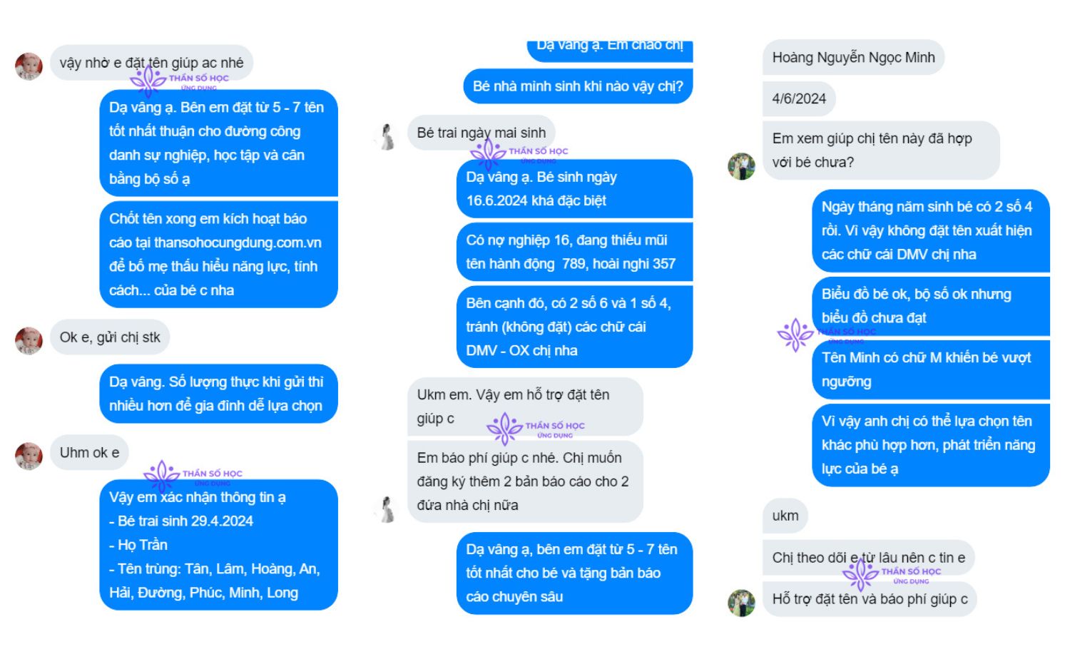 Bạn sẽ nhận được những tên tốt nhất, đẹp nhất cho con giúp con phát huy điểm mạnh, khắc phục điểm yếu, thuận lợi cho đường công danh sự nghiệp sau này. Đồng thời, bạn sẽ được tặng kèm bản báo cáo luận giải tại Thần Số Học Ứng Dụng giúp bố mẹ thấu hiểu con cái, năng lực, tính cách, công việc phù hợp, cách nuôi dạy phù hợp,...